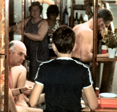 18.45 Ladies again saved the day. Concocted marvellous meal. Fruit juice or grapefruit cocktail, ham in mushroom sauce, angel delight pudding with chocolate wafer, cheese and biscuits & lots of wine.