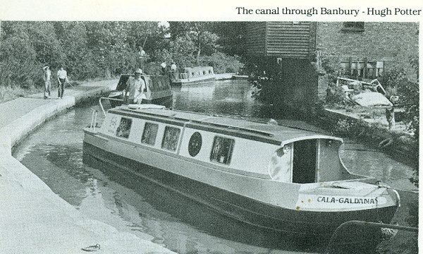 16.00 Moored just below Banbury Lock. Just as we were ready to go ashore a local chap accidently cycled into the canal. Very muddy & embarrassed. Loaned him towel. Ashore Glyn bought a bag of maggots for bait!! The rest of the crew bought wine, chinese food, cream cakes (& fish & chips for Howard & Glyn). Made mental note to return to Banbury to explore this interesting little town. Editorial note: We did return just 24 years later! See the trip report here.